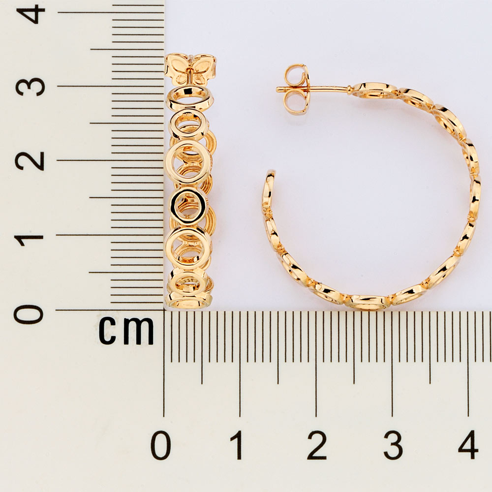 Esta meia argola de círculos vazados, com cerca de 2,0 cm de altura, é banhada em três camadas preciosas de ouro — 24 K na base,