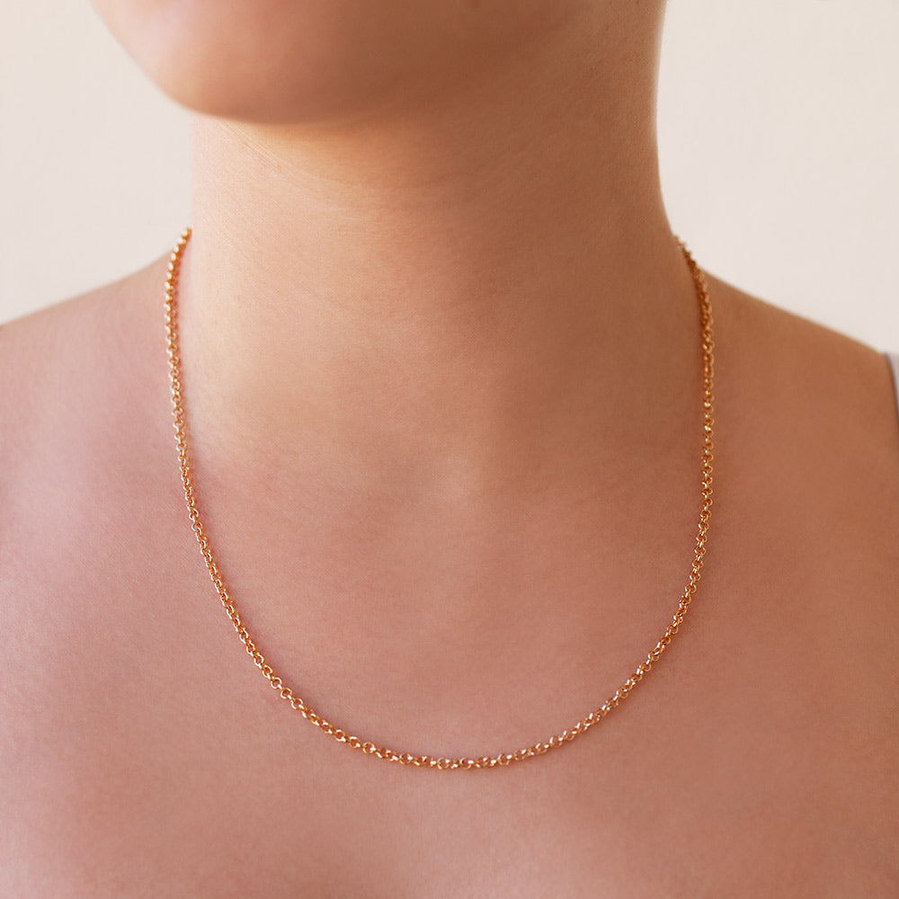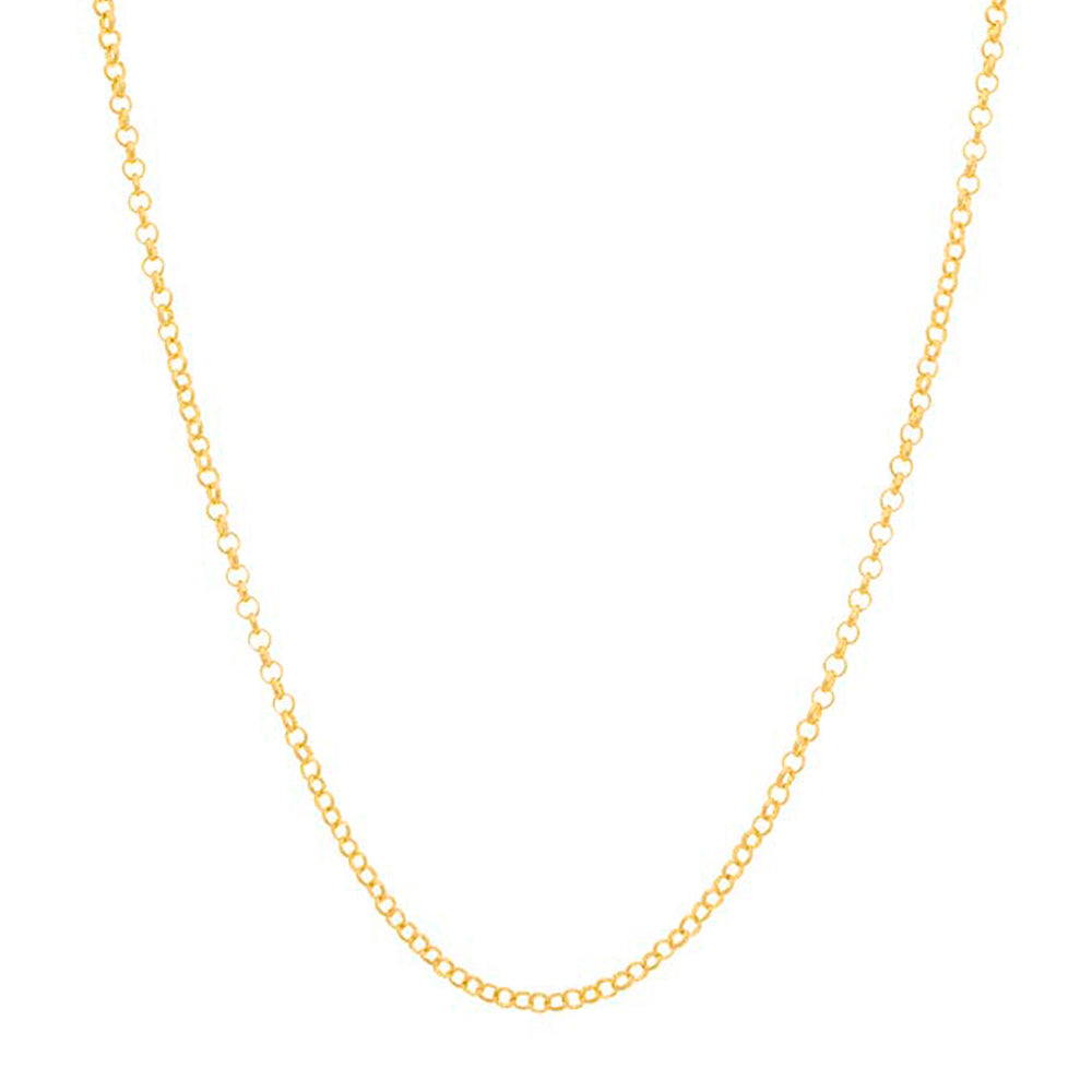 O clássico fio português de 0,80 mm de espessura recebe três camadas de ouro — 24 K na base, 18 K na folheação e 22 K no acabamento, entregando um dourado intenso que remete ao ouro maciço. A corrente de 50 cm possui elos redondos que refletem a luz uniformemente, enquanto a liga livre de níquel garante conforto hipoalergênico mesmo em uso prolongado.